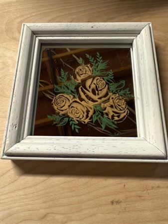 Mirror shadow boxes, $10 for both. These wear engraved and painted on the back side, so the glass is smooth on the front.