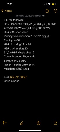 H&R Topper Jr. 20 gauge 3" chamber. Modified choke. Been cerakoted cost $100.Text or call number. No trades. Local cash sale and pickup in butler tn area. $175.00 Posted by: CB0602on 2/28/2026Edited: 2/28/2026