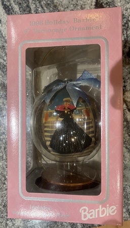 Barbie 1998 Decoupage ornament with wooden ornament stand New 1998 ornament never removed from the box. Also have the original shipping box great collectible for Barbie collectors. $25 $25.00 Posted by: Encore kidon 11/29/2025Edited: 11/28/2025