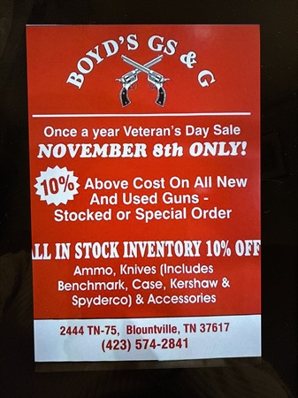 Boyd’s GS & G VETERAN’S DAY SALE Nov 8,2025 Boyd's GS &G Once a year VETERAN'S DAY SALE One day only NOVEMBER 8, 2025 10% Above cost on all NEW and USED guns STOCKED or SPECIAL ORDER ALL IN STOCK INVENTORY 10% OFF Ammo, Knives, ( inc $0.00 Posted by: BoydsGSGon 11/6/2025Edited: 11/6/2025