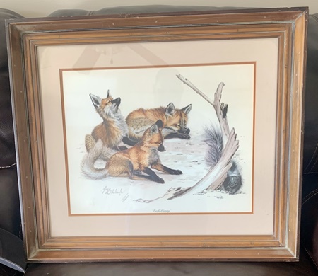 Guy Coheleach Early Warning Framed Lithograph Fox Skunk Wildlife 28" Vintage lithograph print by Guy Coheleach signed, titled “Early Warning,” showing three red foxes being rebuffed by a defensive skunk.Framed but would be better reframed. Comes with paperw $110.00 Posted by: tmedicon 12/1/2025Edited: 12/7/2025