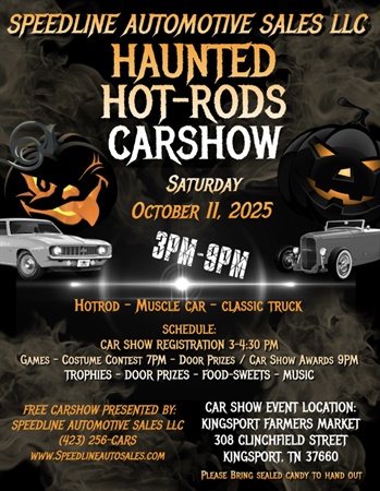 Haunted Hot-Rods Car Show Check us out online for more information. www.Speedlineautosales.com Speedline Automotive Sales LLC 427 Main Street East Mt. Carmel, TN (423) 256-CARS $0.00 Business Posted by: SPEEDLINEon 7/21/2025Edited: 7/20/2025