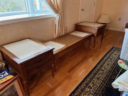 Coffee & End table set 1960” era brown & marble center end tables (two) and one coffee table. Smoke free home. Located in Abingdon, VA. No delivery available. Measurements: Both end tables 20”L X 26” X $200.00 Posted by: gppm04on 10/27/2025Edited: 10/27/2025