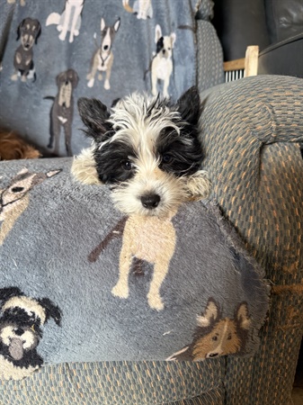Yorkshire Terrier Female Oreo is a KB black Parti Yorkie. She has had two vaccines and is ready to go. Sheis a quiet pup and very loving. She has had two vaccines. She uses pee pads and has not been outside yet. She comes wit $1,600.00 Posted by: Yorkiesruleon 12/9/2025Edited: 12/16/2025