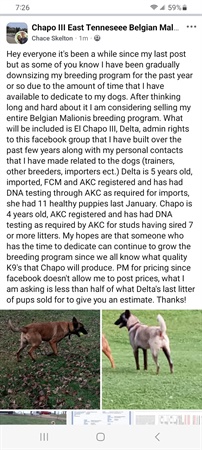 Belgian Malinois breeding business Info is in first picture about what is included and my reason for selling. I can't post prices on facebook but I can here. I sell pups for $1200 each and have a waiting list for pups, I also charge a $5,000.00 Posted by: hillbilly95on 11/20/2025Edited: 11/19/2025