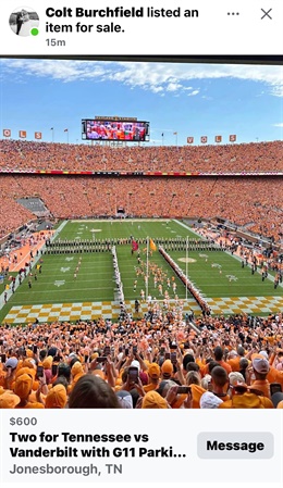 UT tix & parking pass See pics for details! Call 423-483-0562 $600.00 Posted by: 855182on 11/26/2025Edited: 11/25/2025